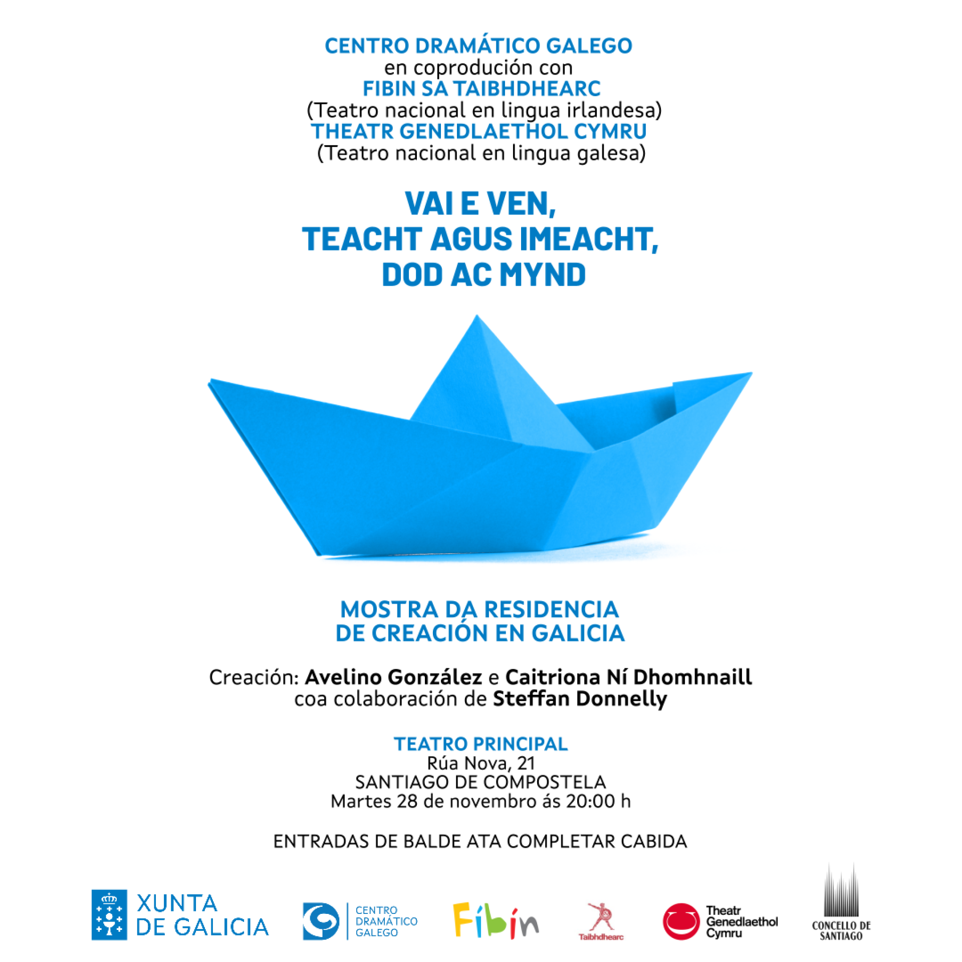 El Centro Dramático Galego y los teatros nacionales en lengua irlandesa (Fíbín – An Taibhdhearc) y galesa (Theatr Genedlaethol Cymru) están sentando las bases creativas para la futura coproducción del espectáculo Va en ven, Teacht Agus Imeacht, Dod Ac Mynd, en una colaboración que nace en paralelo al proyecto europeo Phōnē para la puesta en valor de las lenguas minorizadas a través de las artes escénicas. Con tal fin, Vigo y Santiago de Compostela acogen estos días dos de las residencias artísticas de esta creación, a cargo del actor gallego Avelino González y de la irlandesa Caitriona Ní Dhomhnaill, con el apoyo de Steffan Donnelly, director artístico del Theatr Genedlaethol galés.